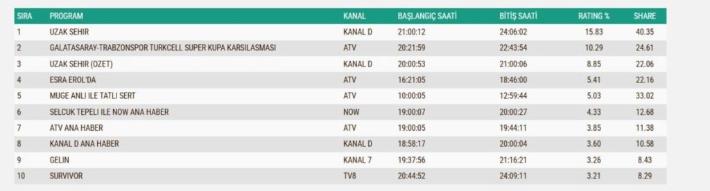 Uzak Şehir 40.35 share oranıyla zirveye otururken, Galatasaray- Trabzonspor maçı 24.61 sharede kaldı.